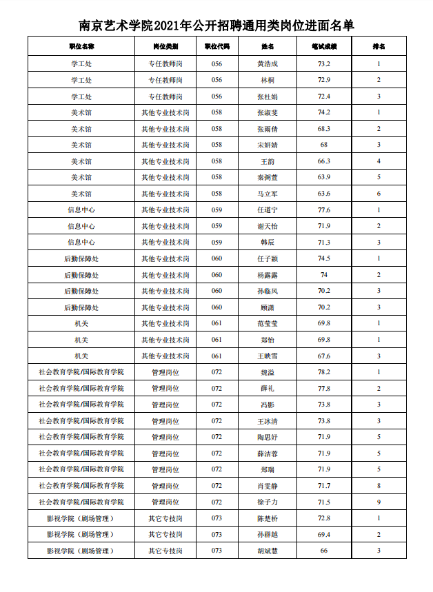 南京艺术学院2021年公开招聘通用类岗位进面名单