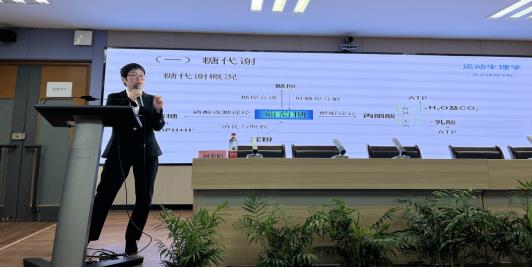 南京体育学院运动健康学院刘秀娟副教授以《运动训练的能量代谢》为题,从四个方面讲述了生动一课。她首先介绍了糖、脂肪、蛋白质三大供能物质在体内的存在形式、代谢过程以及三者代谢之间的关系;其次从能量的来源与消耗两个方面,详细讲解人体运动时的能量供应与消耗,分析了影响能量代谢的因素,其中肌肉活动、情绪波动、食物的热效应、环境温度是主要影响因素;最后,她还科普了能量消耗量测定的方法,包含直接测热法和间接测热法两种。