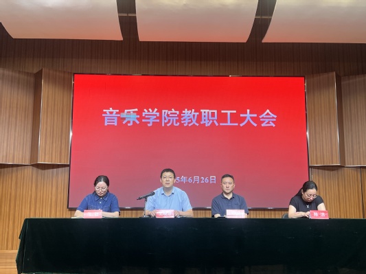 2025年6月26日下午,音乐学院学期末教职工大会在演奏厅举行,总结上半年工作,审议2024年度绩效分配细则,对学期末工作和暑期工作进行部署。