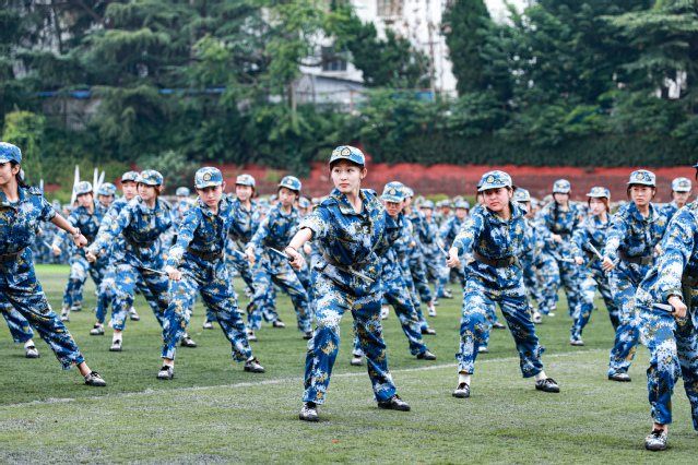 女生方阵的匕首操迅捷凌厉,动作干净利落,展现出“巾帼不让须眉”的果敢与力量。
