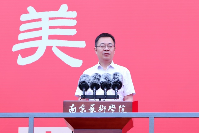 校长张凌浩以“面向积极人生,筑梦创新未来”为题寄语新生。他回顾了“十四五”期间国家在科技与文化领域的辉煌成就,指出艺术与科技的融合正绘就一幅创新的宏伟画卷,特别提及南艺人在九三文艺汇演中的卓越贡献,生动诠释了“闳约深美、不息变动”的校训精神,激励新生体悟这八字背后蕴含百年积淀的智慧与担当。他引用了四段古语为同学们指明成长路径:一是见贤思齐,以似以续。希望同学们要用与时俱进的心境,来探索艺术创作的新方式、拓展艺术实践新领域。二是山积而高,泽积而长。勉励同学们要用博观约取的态度,来提升艺术作品新格局、磨练艺术造诣新境界。三是不舍昼夜,日新盛德。希望同学们要用熔今铸古的气概,来携手艺术发展新方向、提供科技进步新动力。四是乐只君子,德音不已。号召同学们要以开放包容的心态,来创造中国故事新讲法,打造人类文明新形态。他勉励全体新生:生逢盛世,当不负盛世;生逢其时,当奋斗其时。希望同学们以“闳约”的气象,用艺术激情去奏响前进号角;以“深美”的气度,用艺术精神去携手科技进步;以“不息变动”的气概,用艺术创造辉映时代之光!
