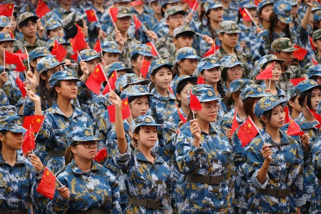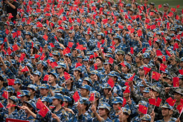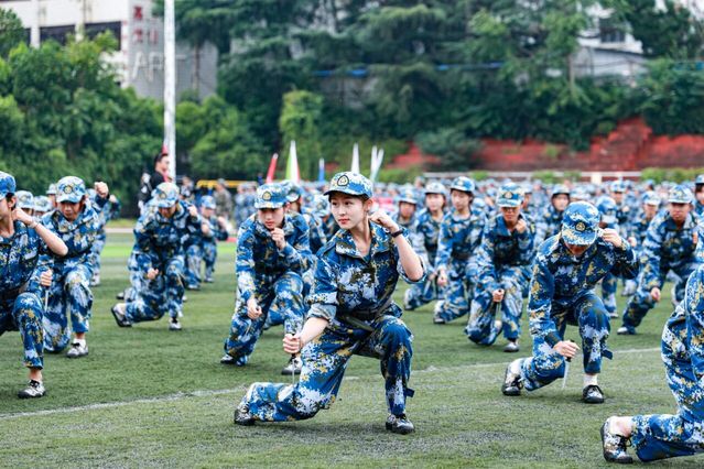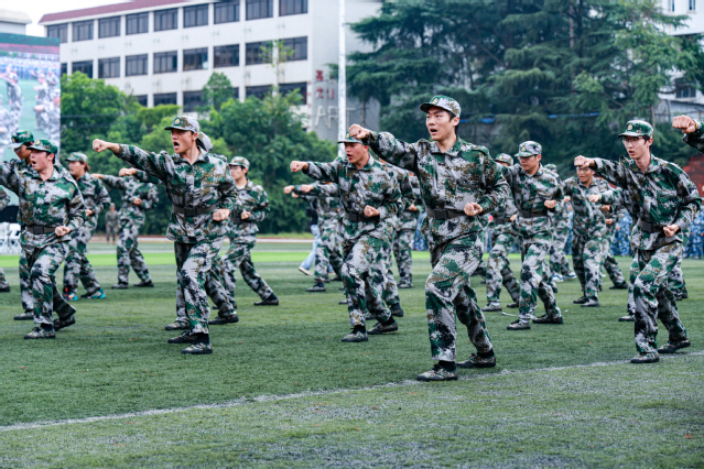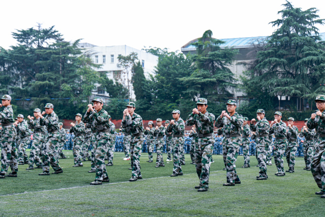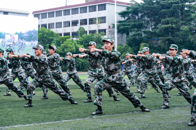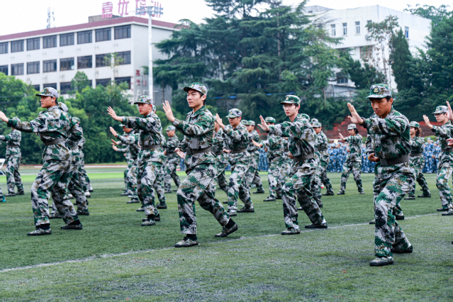 男生方阵的军体拳刚猛有力,吼声震天,拳脚间尽显血性与铁纪凝成的战阵默契。