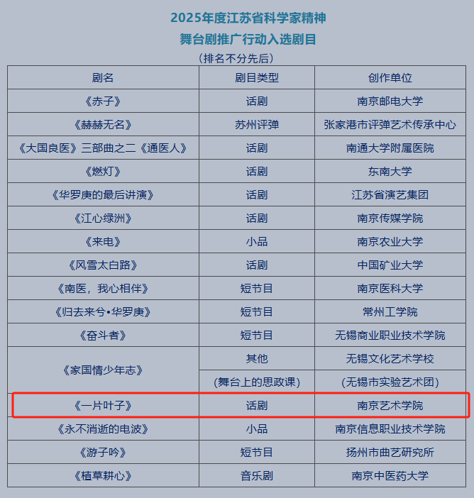 根据省科协、省教育厅、团省委、省文联、中国科学院南京分院联合印发的《关于开展2025年度江苏省科学家精神舞台剧推广行动的通知》(苏科协发〔2025〕49号)精神及要求,经宣传发动、申报推荐、专家评审和社会公示等环节,现确定《赤子》等16部剧目为“2025年度江苏省科学家精神舞台剧推广行动”入选剧目。