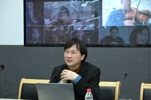 讲座中,李小兵首先分享了自己的原创歌曲《我们》。作品通过人工智能技术将一万人的云端演唱进行筛选对齐,并汇集了来自世界各地音乐家的隔空演奏。李小兵介绍了中央音乐学院音乐人工智能中心、电子音乐中心、音乐与脑科学中心的相关情况,并介绍了国家社科基金重大项目《音乐与人工智能协同创新发展理论研究》及国家自然科学基金专项项目《音乐智能量化和脑科学认知研究》的相关研究进展。随后,李小兵对AI音乐创作与分析、十二音作曲系统、机器人指挥、声源分离、卡拉ok评分、“央音1号”音乐脑机接口、AI音乐治疗等领域的研究进行阐述,并积极推进这些成果服务国家、服务社会。