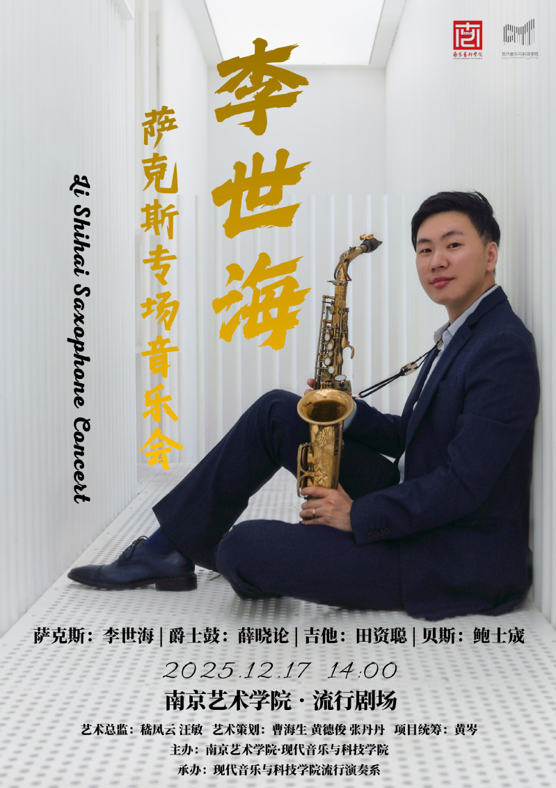 2025年12月17日下午2时,萨克斯演奏家李世海于南京艺术学院流行剧场呈现个人专场音乐会,携手鼓手薛晓论、吉他手田资聪、贝斯手鲍士宬,共同完成一场结构严谨而情感丰沛的爵士现场。音乐会由南京艺术学院现代音乐与科技学院主办,既是一次专业演奏的集中展示,亦成为观察当代中国爵士生态的一扇窗口。