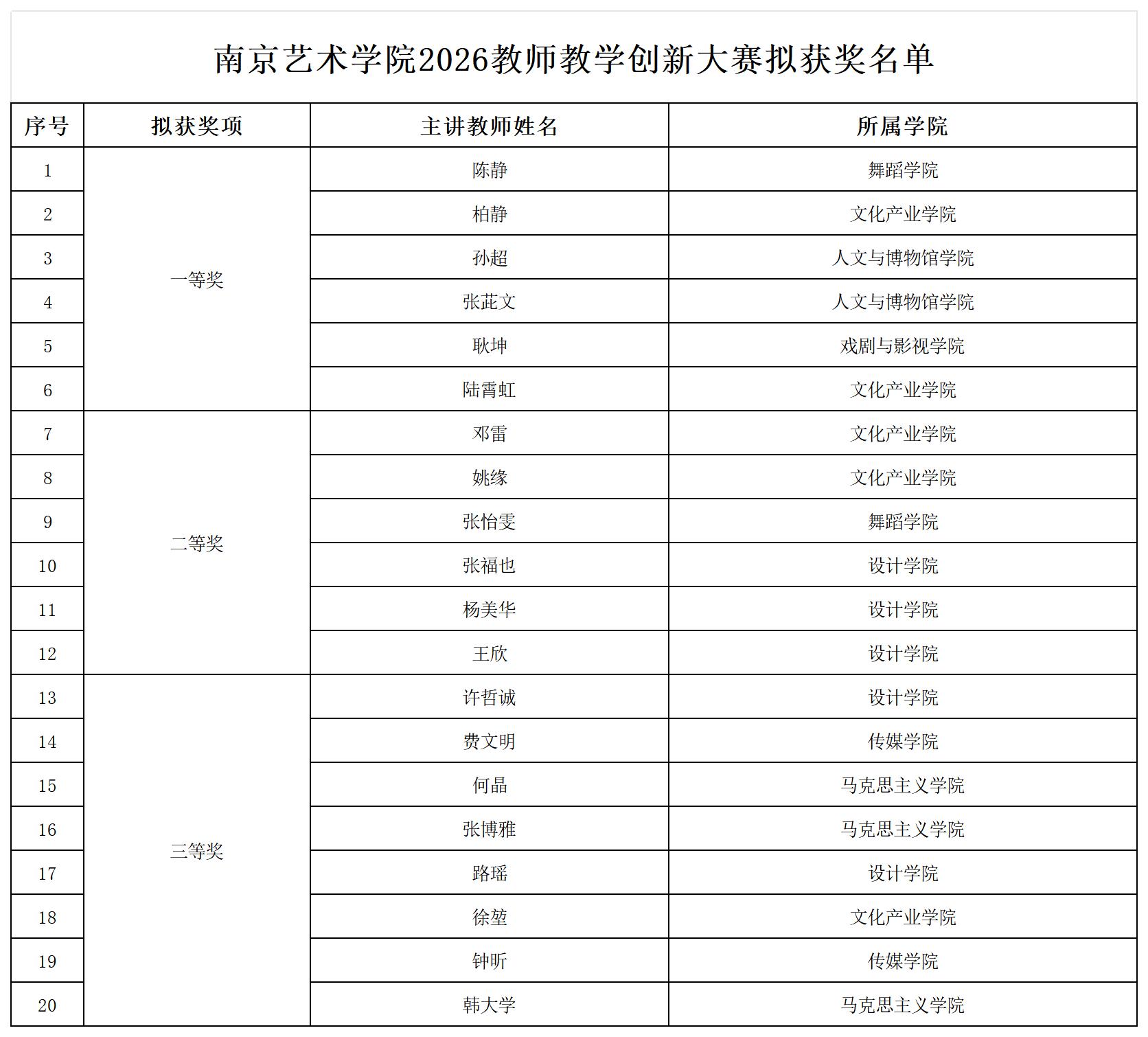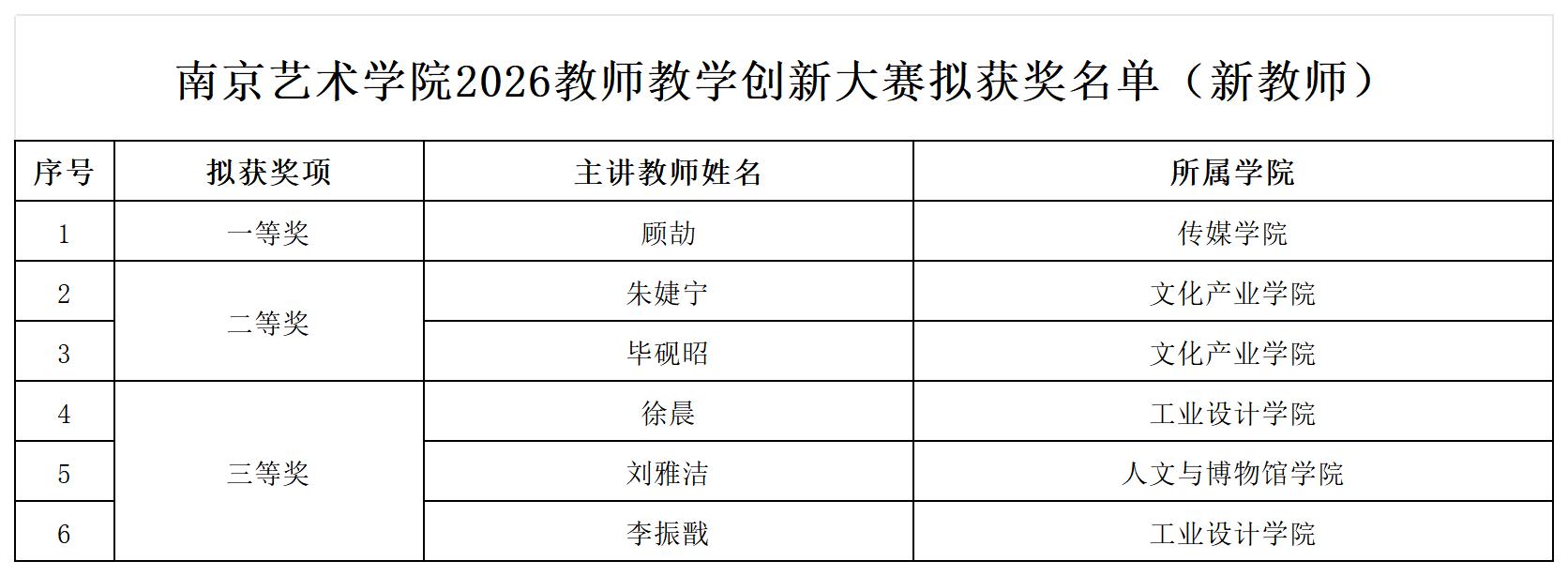 附:南京艺术学院2026年教师教学创新大赛暨第六届江苏省高校教师教学创新大赛选拔赛拟获奖名单
