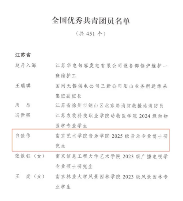 近日,共青团中央公布了新一批全国“两红两优”名单,即全国五四红旗团委、全国五四红旗团支部、全国优秀共青团员、全国优秀共青团干部,我校音乐学院2025级博士研究生白佳伟荣获“全国优秀共青团员”称号。