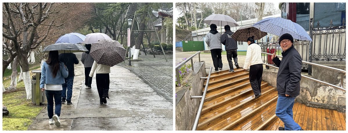 14:00,参与活动的教职工便陆续抵达古林公园北门。活动正式拉开帷幕。老师们撑着雨伞,身着轻便装束,沿着预设路线——途经牡丹园、中心草坪等景点,精神抖擞地踏上约3公里的环形步道。春雨润如酥,空气格外清新。大家一边呼吸着富含负氧离子的新鲜空气,一边欣赏着烟雨迷蒙的金陵春色,欢声笑语交织在雨幕中。