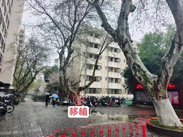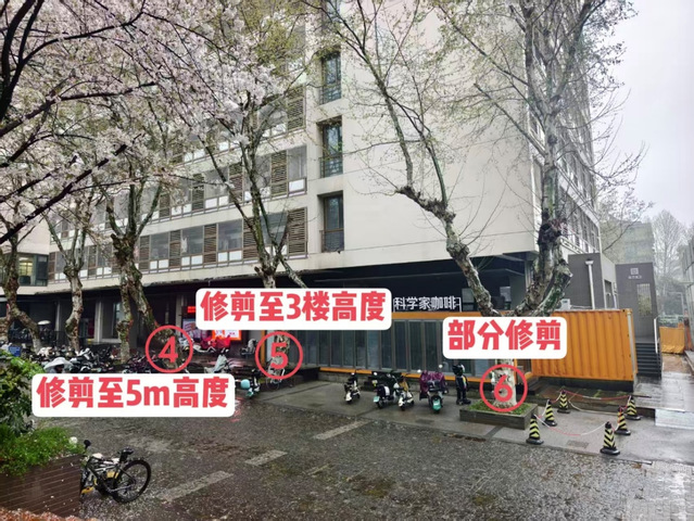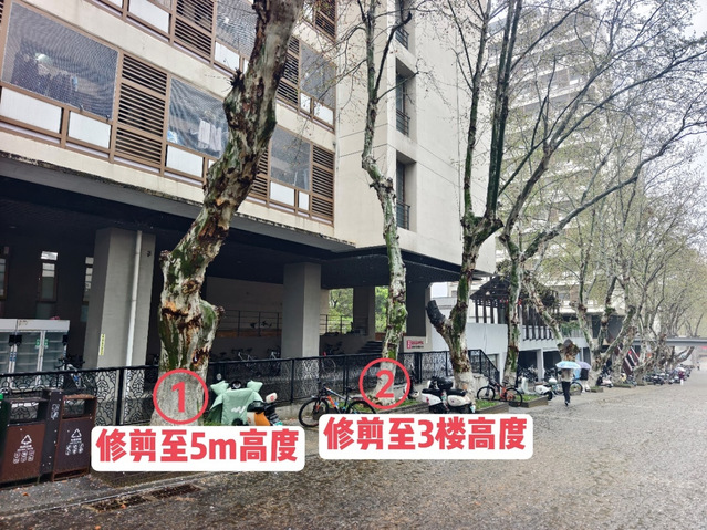 我校44号和45号宿舍楼前树木高大,已影响消防登高扑救面正常作业,不符合《建筑设计防火规范》。为消除消防隐患,确保学生安全,经与校保卫处会商,拟于近期对44号和45号宿舍楼前步行街区域6棵法桐树进行截干修剪或移植(具体方案见附图),以满足消防安全规范要求,同时将适时补种景观树种美化校园。